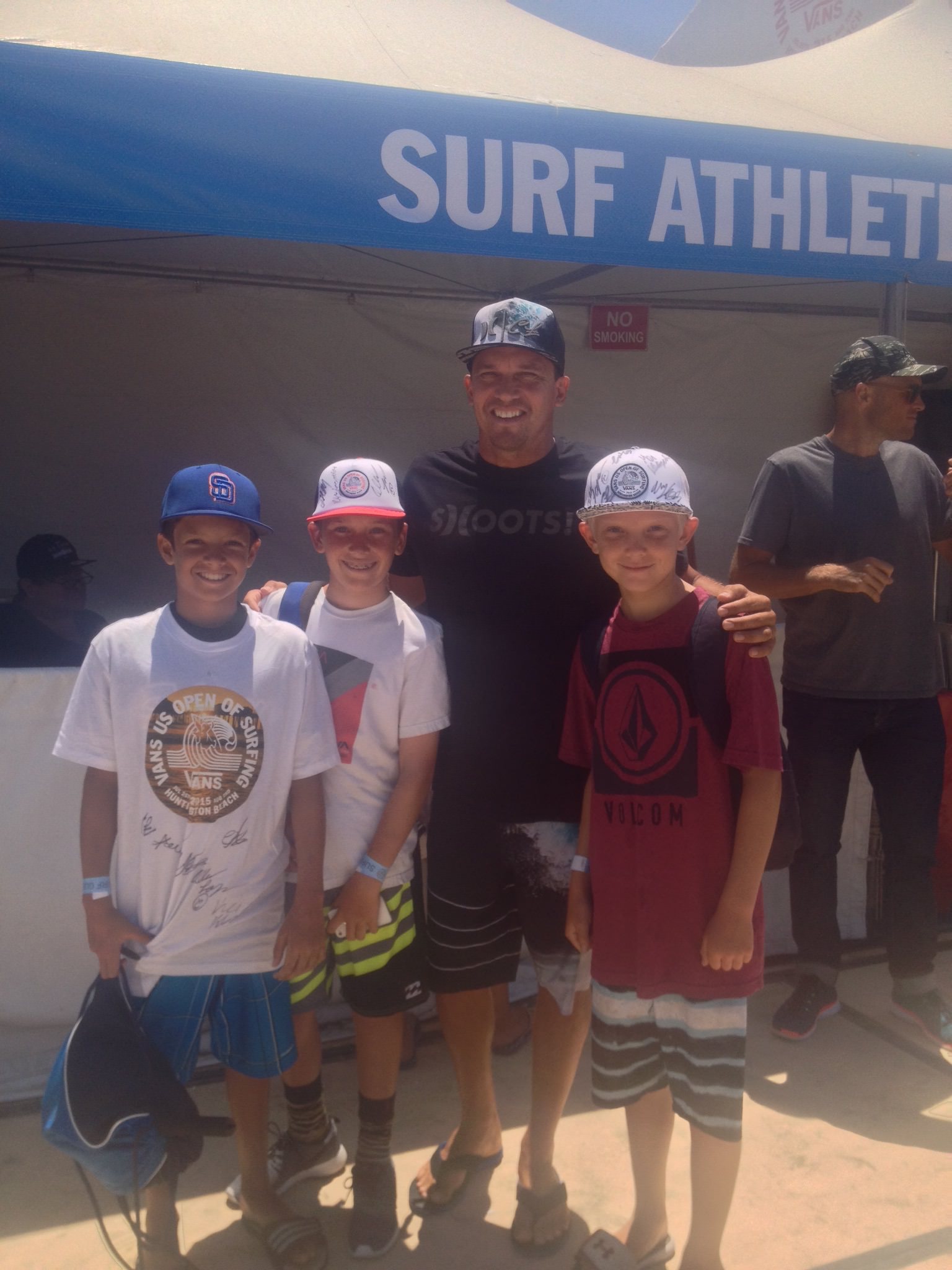 Fortunately for Luke, Sean, and Grant, their week of travel camp coincided with the U.S Open of Surfing, the largest surf contest in the world. After four consecutive days of surfing Swamis, Tourmaline, Torrey Pines, Windansea, and San Elijo in Encinitas, the boys were excited to take a day off and watch some professional surfing. So we loaded my Jeep up at 8 o’clock in the morning and headed towards Huntington Beach. On the way there, we played “Attractive Distractions” off my laptop and the boys quickly found themselves admiring the surfing antics of Albee Layer. Little did they know, that they would go on to meet Albee an hour later and get his autograph on their official U.S Open memorabilia.