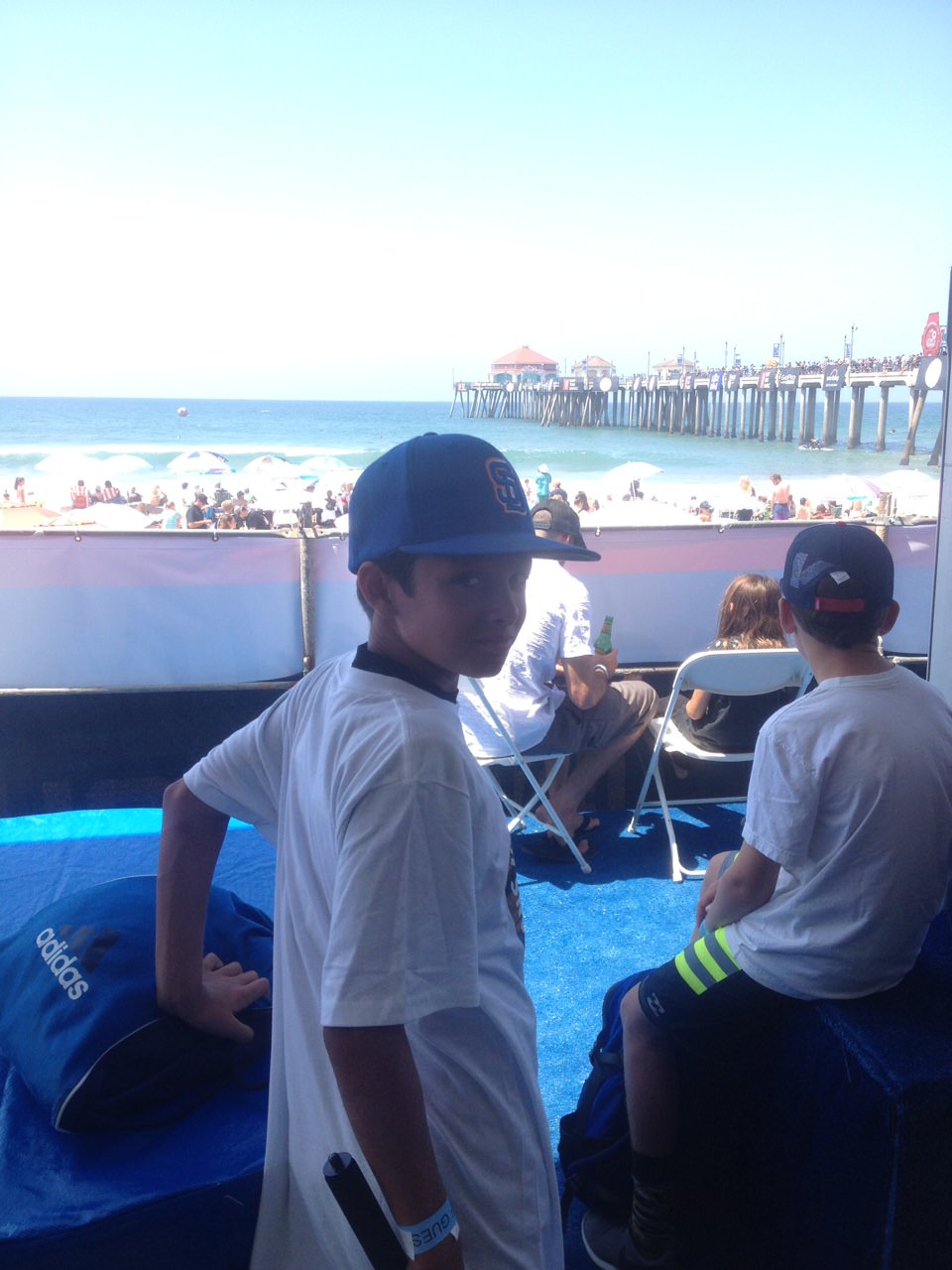 Due to my involvement within the surf industry, I was able to score the boys V.I.P guest passes that allowed them to view the action from the comfy confines of the W.S.L tent. Once we got our wristbands, we were able to dine on the complimentary food and drink, have access to a wide variety of professional surfers for autographs and even cut to the front of the line for the Samsung Galaxy Virtual Surfing Experience.